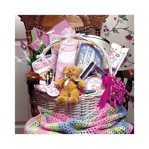 Welcome to the world! Greet baby and the proud parents in grand style with this gift that includes layette essentials, a first teddy bear, a lullaby CD, grown-up yummies, baby time capsule and baby's first footprint kit. (3-6 months)