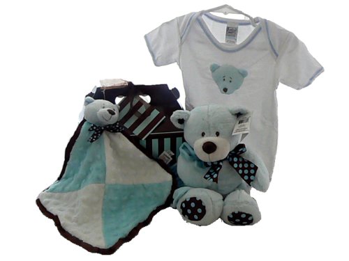 Sweet as chocolate drops, new babies are a joy to buy for. This little gift set, with it's contrasting chocolate brown and pastel coloring is a great way to welcome a new little one. The plush baby bear is just adorable, cuddling it's own blankie and wearing a large satin bow, it makes a great nursery accent, as well as a huggable friend who rattles. The little blankie bear can follow your little one around wherever they go, soft to the touch and with the tiniest little rattle, it will keep little hands happily occupied. Then the onesie is for Mom, who will only have a short while to dress up baby in all kinds of silly little outfits, before baby wants to dress themself. The plush animal is an unexpected little touch to this garment. All packaged and ready for gifting in a striped gable box, it's ready to be received by the expecting parents.