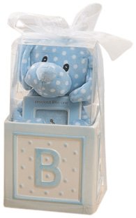 picture frames / photo frames: A special gift set that will surely be a most appreciated newborn gift or just for youself Gift set includes a pastel blue ceramic planter with alphabet letters; plush polka-dot blue puppy AND coordintated mini photo frame that holds a select 2"x3" photo. An adorable satin bow tops the package. Produced expressly for SendAFrame by GUND®.